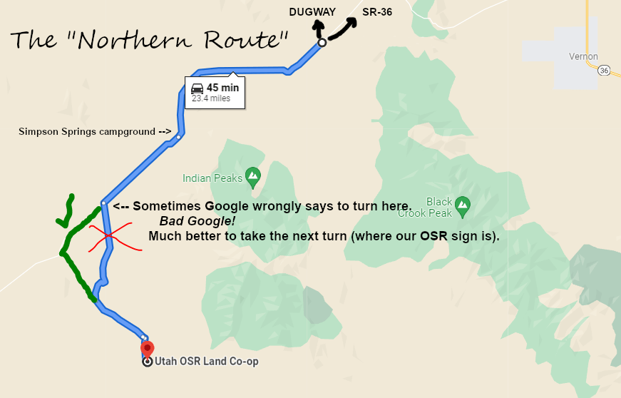 Use Google Maps and search for “Utah OSR”. if you don’t have new or extra-strength tires, you might consider going to Dugway first, it’s paved all the way there. Takes a little longer, but it’s a much better road. Then turn directly South just past the LDS Church. That road will take you to the Pony Express Trail road where you turn right/West. Then 7.2 miles after the Simpson Springs campground, you’ll turn left on River Bottom Rd and go 7 miles to our 12′ tall green gate on the left. It will have a big chain and lock on it only to keep the cows out. So drive through it to the Welcome Center and go inside.